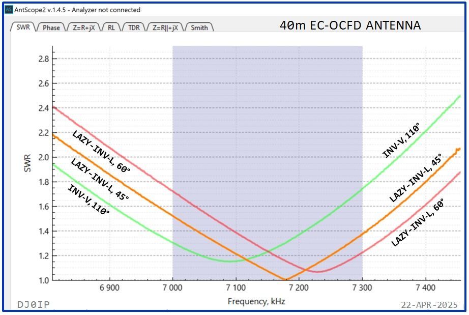 The graph on the right compares the SWR Curves of the INV-V configuration with the Curves of the Lazy INV-L with a 60 degree angle and a 45 degree angle.