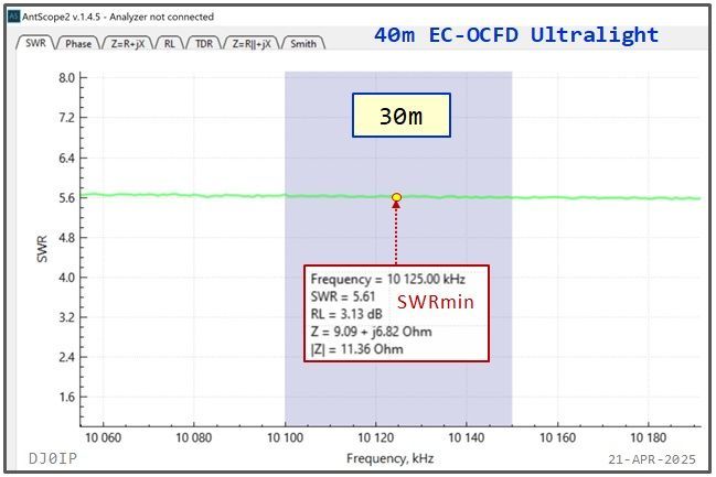 Regardless of configuration, the SWR on the fundamental band (40m) remains under 1.8:1 across the entire band.