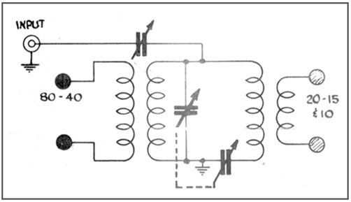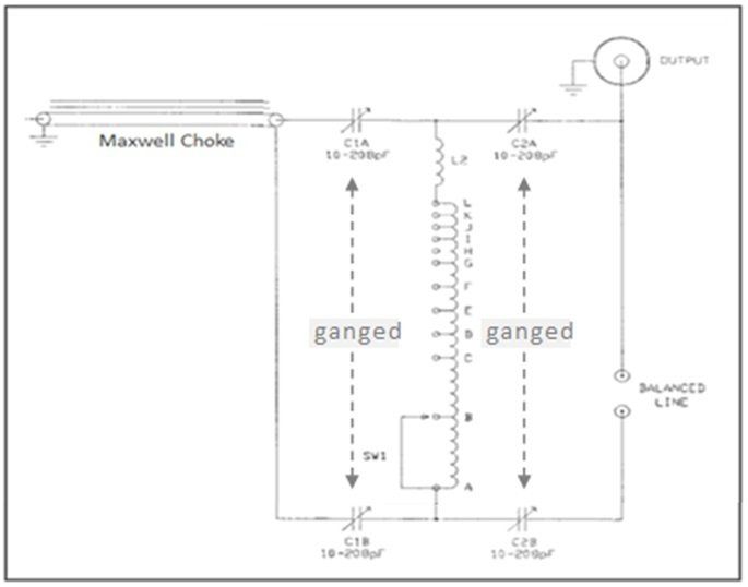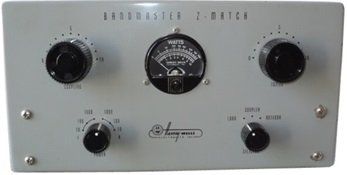 The models A and B are identical, except for the color of their enclosure. The circuit is a Modified L-Network. Fundamentally it is an L-Network with the capacitor switchable to the input side of the coil for low impedance matching, or to the output side of the coil for high impedance matching. It has a 500 pF variable capacitor to which additional banks of capacitance may be switch in parallel to increase the impedance matching range.