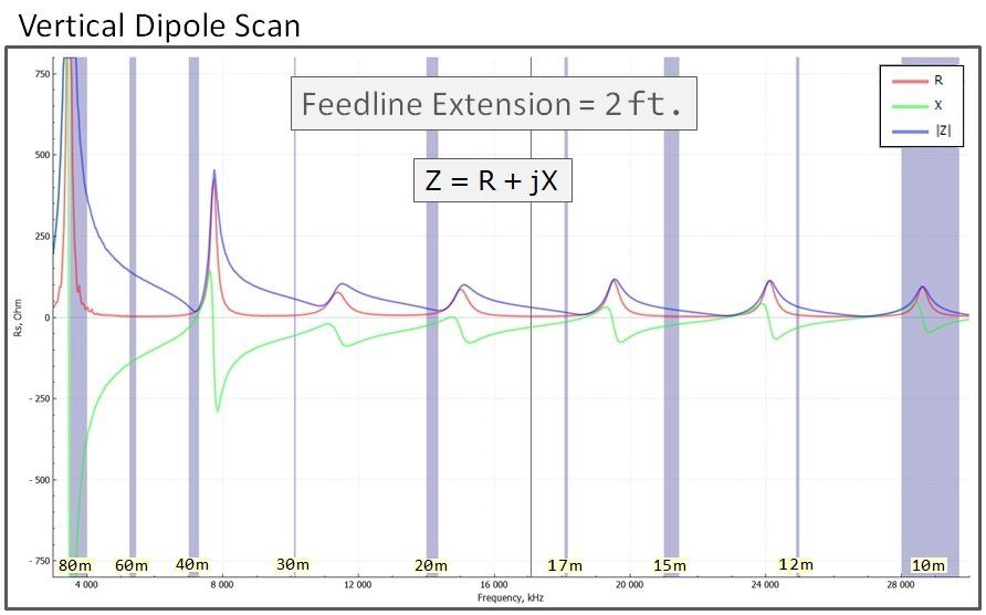 Click (left graph) to open the first graph (0 ft.), then on the right side, click the arrow rapidly to scroll through 2 ft., 7 ft. and 14 ft. graphs. Watch the curves shift with different feedline lengths.