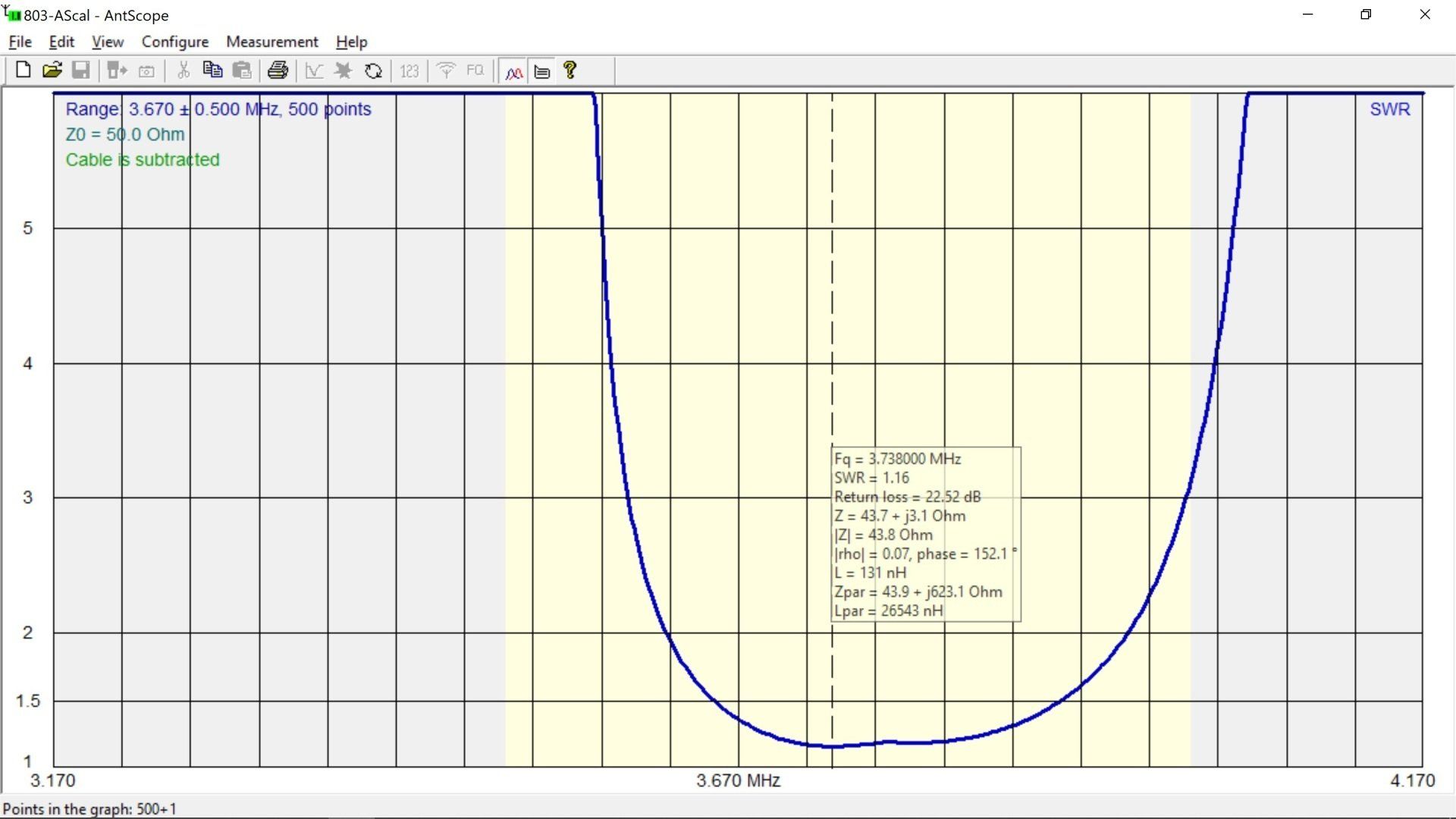 As a sanity check, I exported the data from the graph on the left to a CSV file. Then I opened AntScope-1 (the original AntScope) and imported the CSV file. It seems to be an SWR of 1.16 at 3.738 MHz.