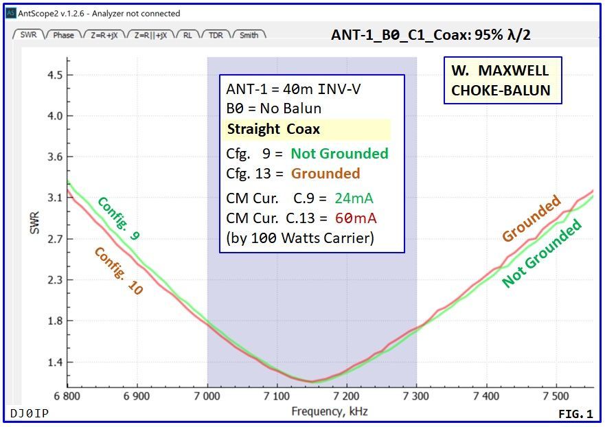 FIG.2: With a Maxwell Choke-Balun (C1) inserted at the feedpoint and the system floating, CM Current has increased slightly, because there really is no low impedance path to ground. When the system is grounded (i.e., through the A.C. mains ground), a low impedance path to ground is established and Common Mode Current is increased significantly. How much depends on how good (or poor) the balun or choke at the feedpoint is.