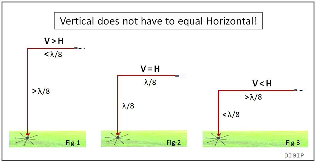 Most people have probably heard of the Inverted-L antenna before. As stated on the previous page, it consists of both vertically polarized radiation and horizontally polarized radiation. How much radiation of each type depends on the shape of the Inv-L. There are 3 possibilities, shown on Fig.1-3 below.