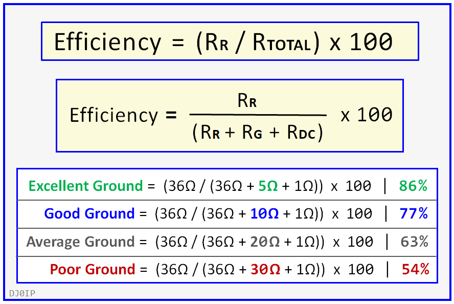 GROUND RESISTANCE (RG) is the loss caused by the ground beneath the antenna. Ground resistance can vary from very low values of 5 ohms, up to more than 100 ohms (5-30 ohms is a frequently quoted range). The RF power dissipated in the ground resistance is not available for radiation. We can lower ground resistance by improving the radial network below the antenna.