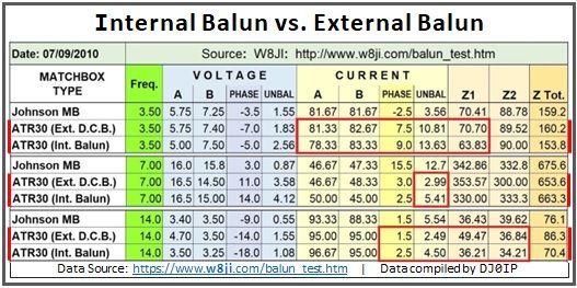 The table on the right is - an excerpt from the table above, shows the difference between internal and external baluns.