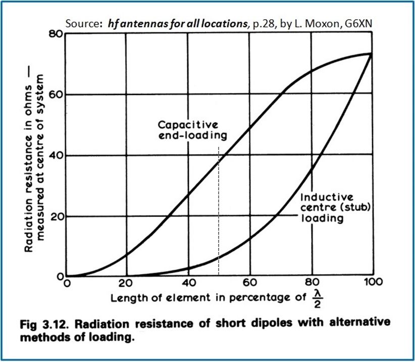 The graph below shows the effect on Radiation Resistance when shortening the antenna with capacitive, inductive, or linear loading.