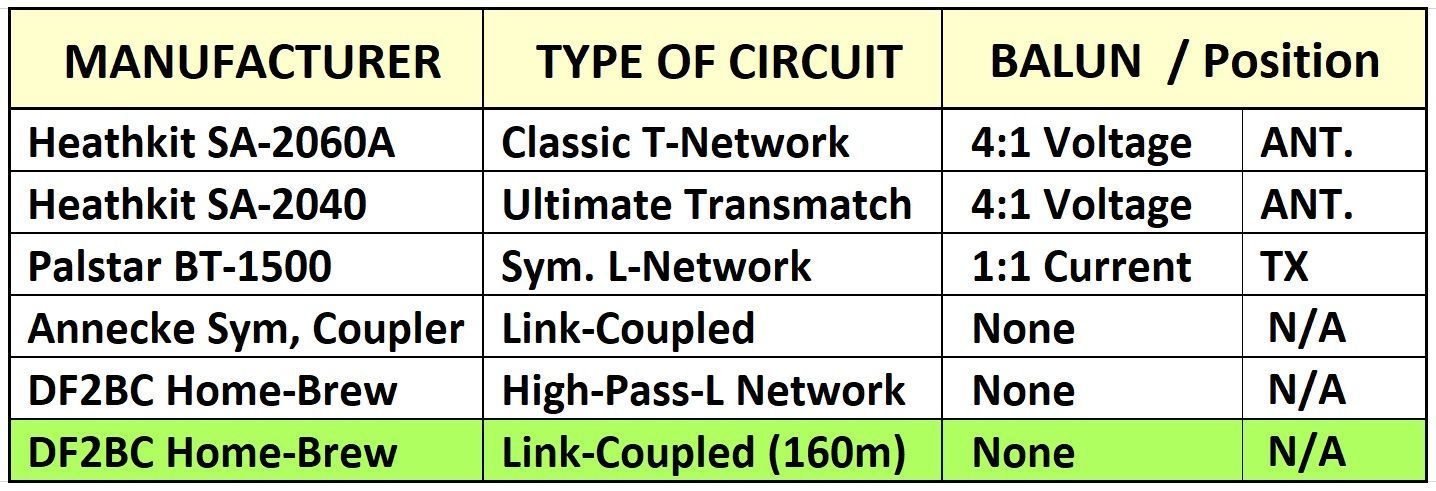 - The Heathkit and SA-2060A and DF2BC's home-brew 160m Parallel Coupler were the only two tuners that could match the antenna on 160m.