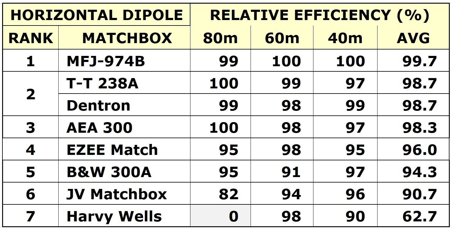 No matchbox performed best on all bands. The ranking order of the matchboxes on each band was different from the ranking on other bands. The Ten-Tec 238A and MFJ-974 were the two best matchboxes overall with this antenna.