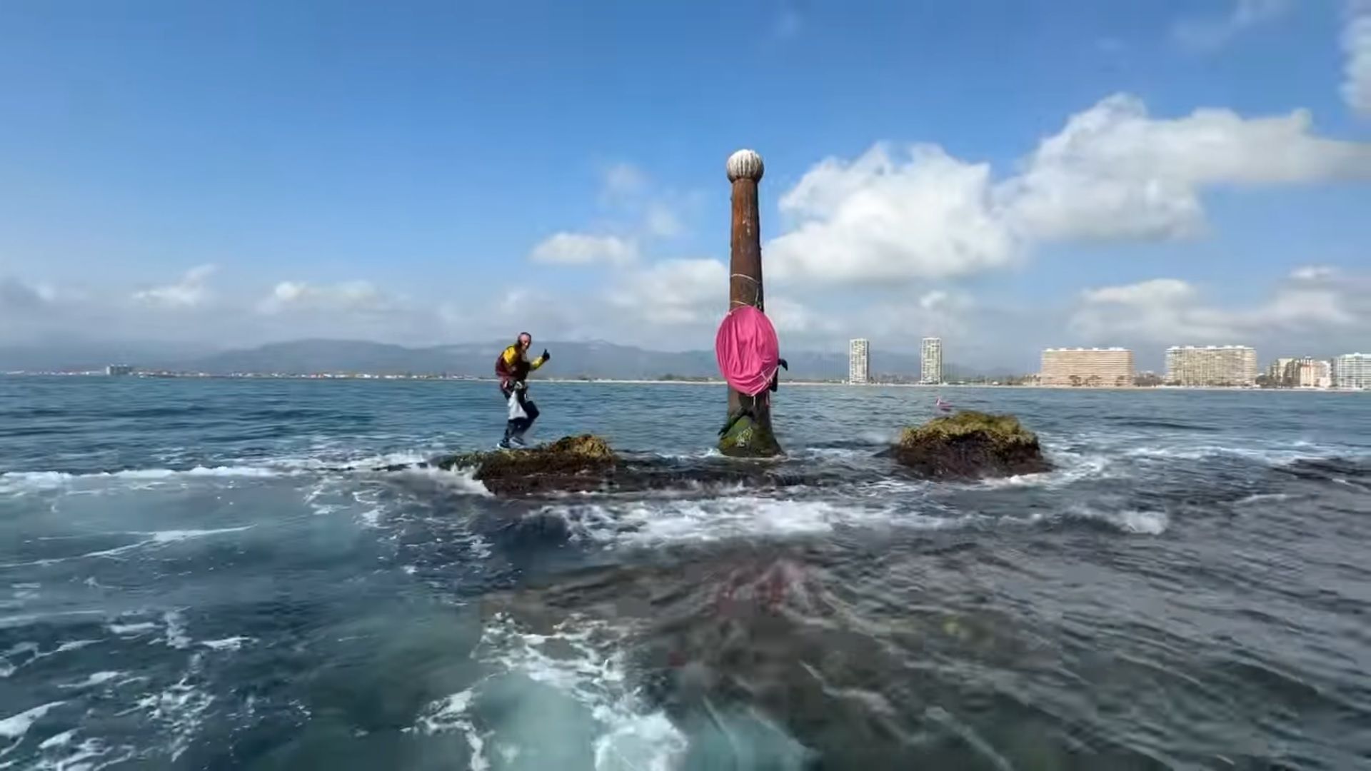 The photo above is a screen shot taken from a video showing Emil jumping from the boat and swimming to the rock. It is posted on Facebook.