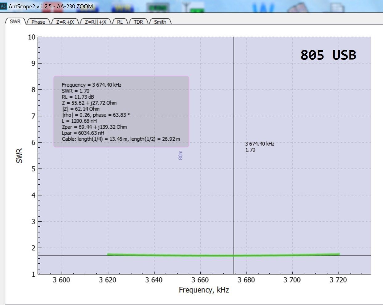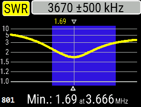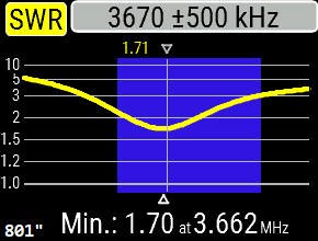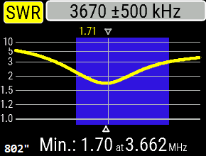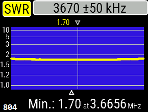 The SWR was oscillating between 1.70:1 and 1.71:1 from 3654.4 to 3684.0 kHz; a total of 29.6 kHz.