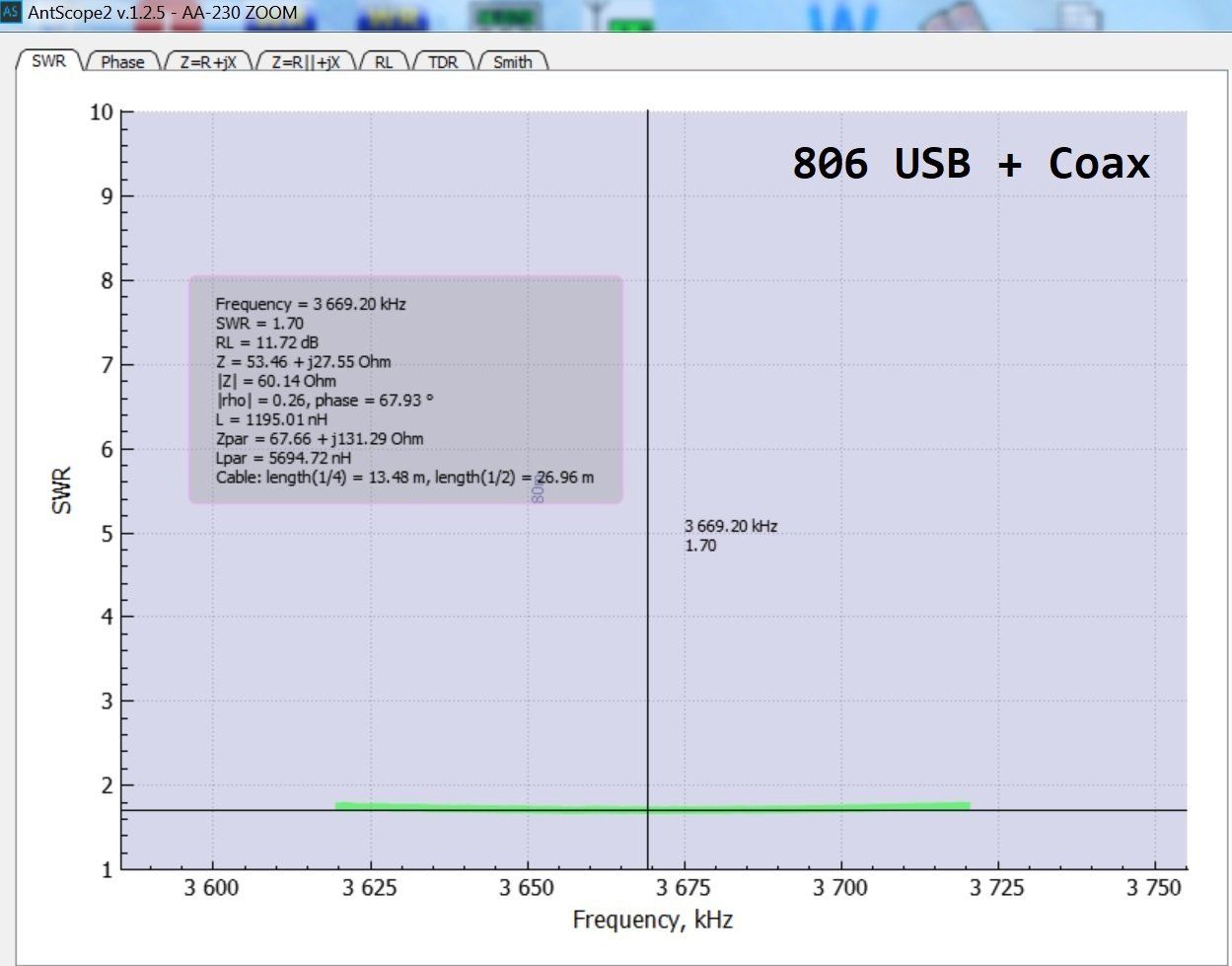 The SWR was oscillating between 1.70:1 and 1.71:1 from 3652.0 to 3686.0 kHz; a total of 34 kHz. This is even broader than when Floating (above).