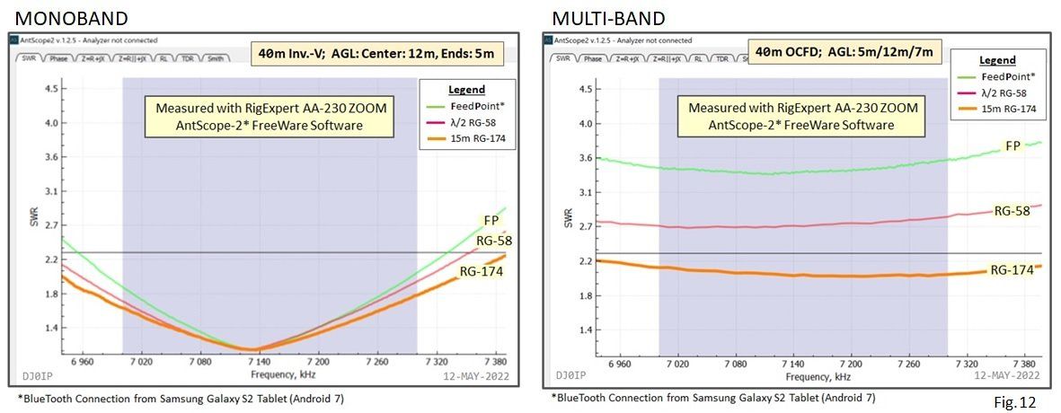 In the curve on the right, the feedpoint impedance is not 50 Ohms. In this case, all three curves are quite far apart. Unless we measure the antenna directly at its feedpoint, we really have no idea of its true impedance.