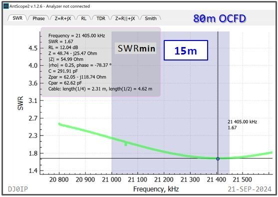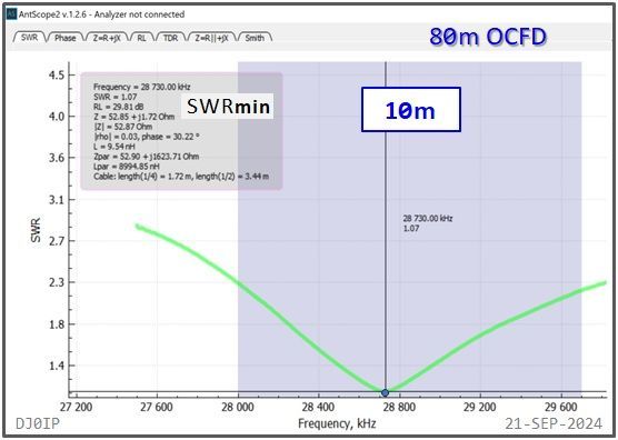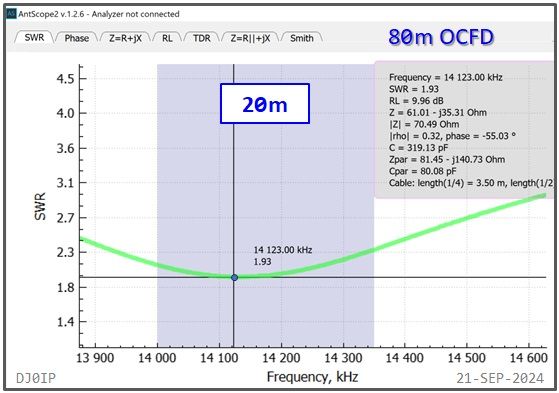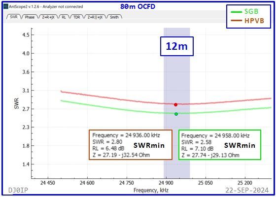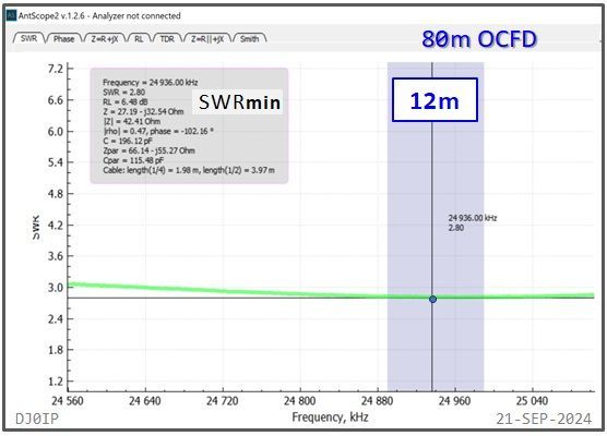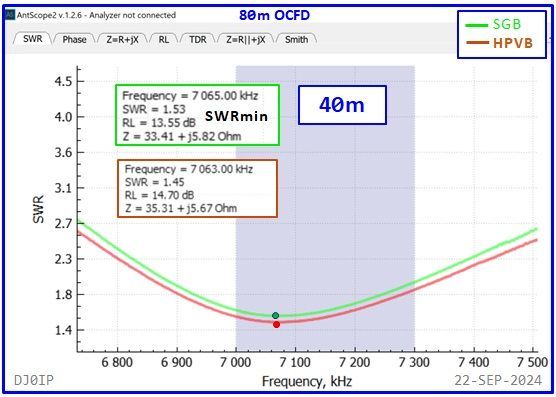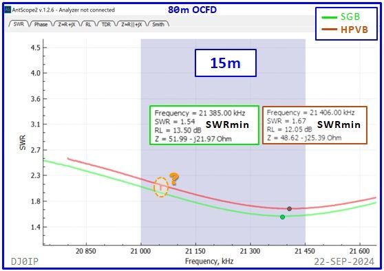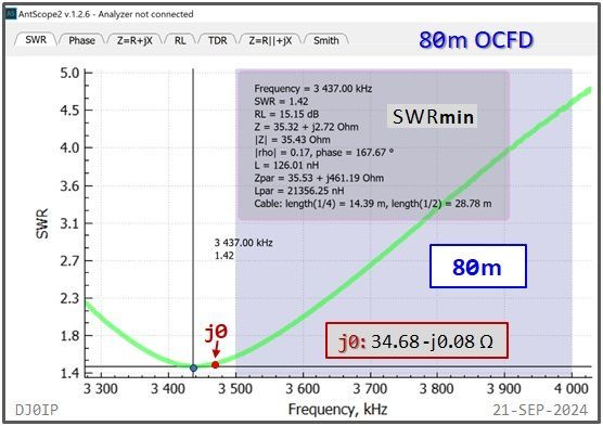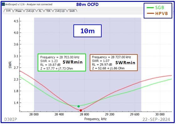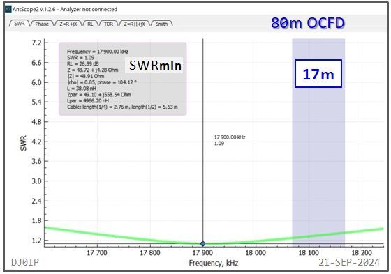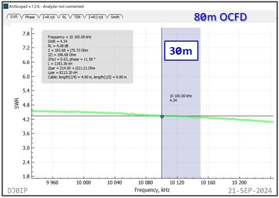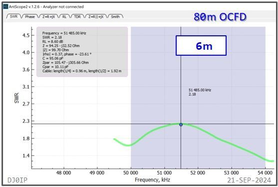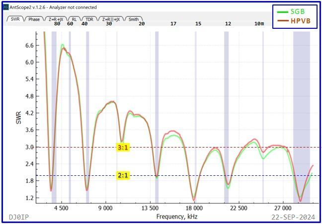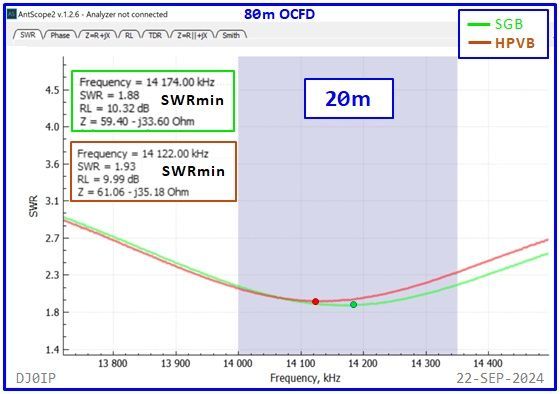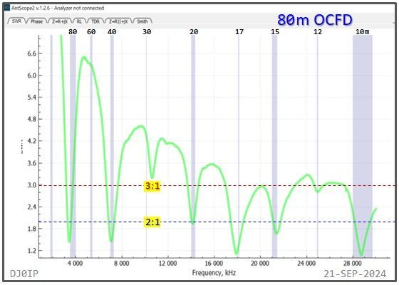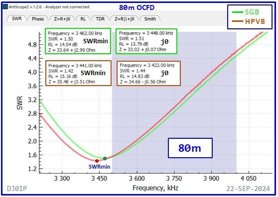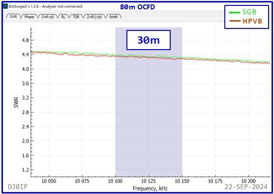 The Hybrid-Balun consisting of my standard 4:1 Ruthroff (SRB) + this Vitroperm 1:1 Choke was inserted into an 80m OCFD antenna and measured with a scanning antenna analyzer (RigExpert AA-230 ZOOM).