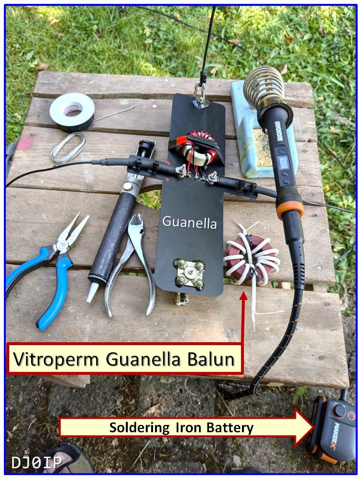 I purchased a battery-powered 70 Watt soldering iron in preparation for this project. It came with a hefty lithium battery. With this I can lower the balun box and swap either balun in the field, without having to take down the antenna.