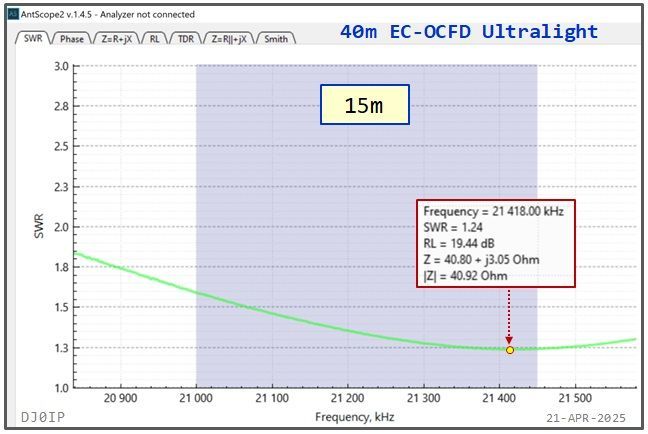 Regardless of configuration, the SWR on the fundamental band (40m) remains under 1.8:1 across the entire band.