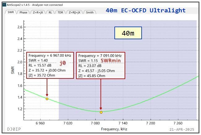 In order for the frequency of minimum SWR to be inside the harmonic bands, it is necessary to trim the overall length of the antenna such that minimum SWR on 40m occurs below the band.