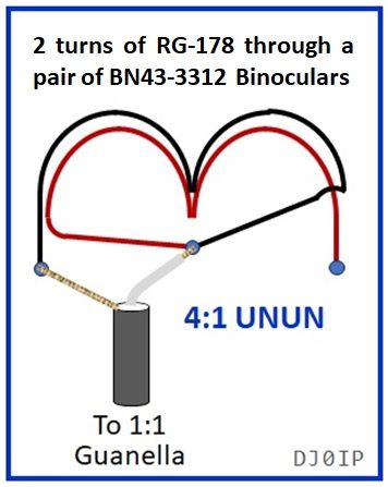 A pair of BN43-3312 binoculars are glued together and wound with 2 turns of RG-178 coax, a thin and lightweight Teflon-insulated coax, providing a 4:1 impedance match to the antenna.