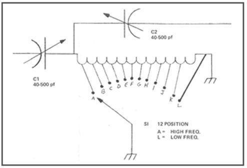 The models A and B are identical, except for the color of their enclosure. The circuit is a Modified L-Network. Fundamentally it is an L-Network with the capacitor switchable to the input side of the coil for low impedance matching, or to the output side of the coil for high impedance matching. It has a 500 pF variable capacitor to which additional banks of capacitance may be switch in parallel to increase the impedance matching range.