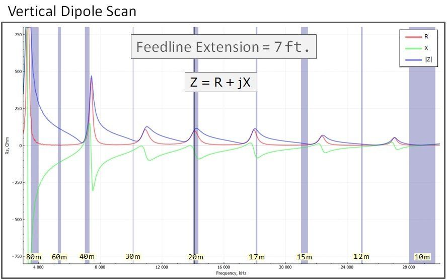 Click (left graph) to open the first graph (0 ft.), then on the right side, click the arrow rapidly to scroll through 2 ft., 7 ft. and 14 ft. graphs. Watch the curves shift with different feedline lengths.