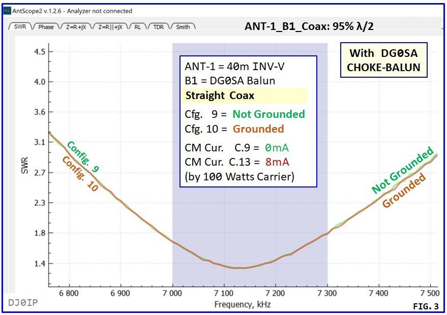 With the coax straight at a 90 degree angle (Fig.3), there is basically no difference (i.e., just 8mA) whether the system is floating or grounded - again due to there being no low impedance path to ground along the coax. In this case the balun has enough Common Mode Impedance to impede the small amount of CM Current that would otherwise be generated at the feedpoint.