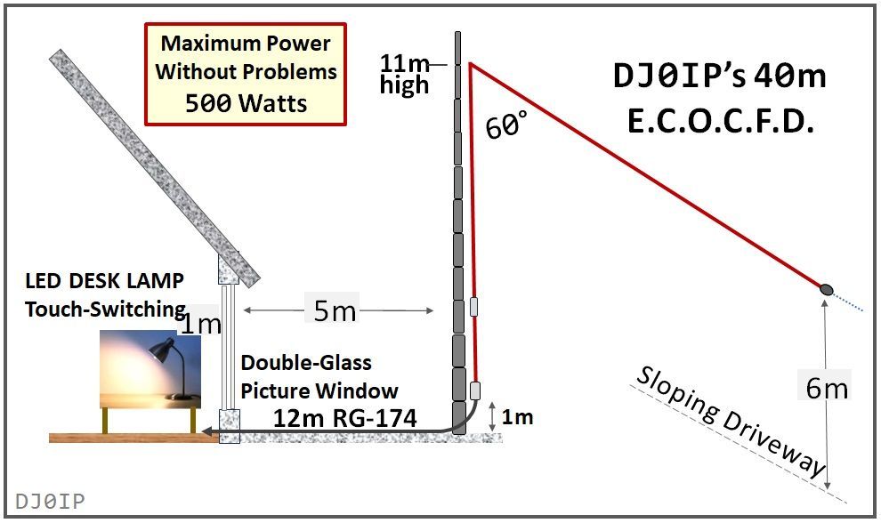 The feedpoint of the ECOCFD antenna is not the point where the coax feedline attaches to the antenna. It is at the 4:1 Ruthroff UNUN (shown at a height of about 5m in the drawing).