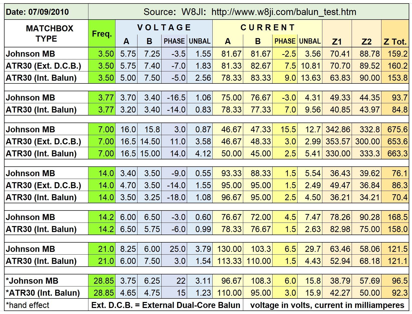 You will notice that two sets of measurements are shown for the ATR-30 on some of the bands. Like most asymmetrical antenna matchboxes, the ATR-30 has a built-in balun - but that is not always good. On some bands, Tom tested using a home-brew external dual-core balun instead of the built-in balun.