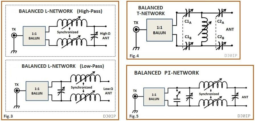 In the past few decades, newer balanced matchbox designs have become available. Though not link-coupled, they are true balanced tuners. These are shown in figures 3, 4, & 5 below:
