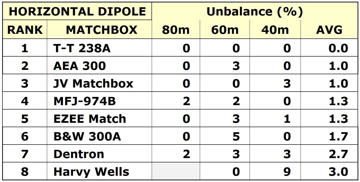 In general, the unbalanced matchboxes using an external balun performed just as well as the symmetrical matchboxes.