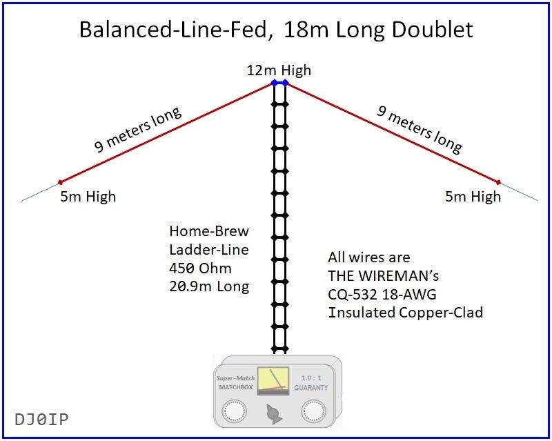 - Fed with 20.9 meters of 450 Ohm Ladder-Line (about 70 ft.)