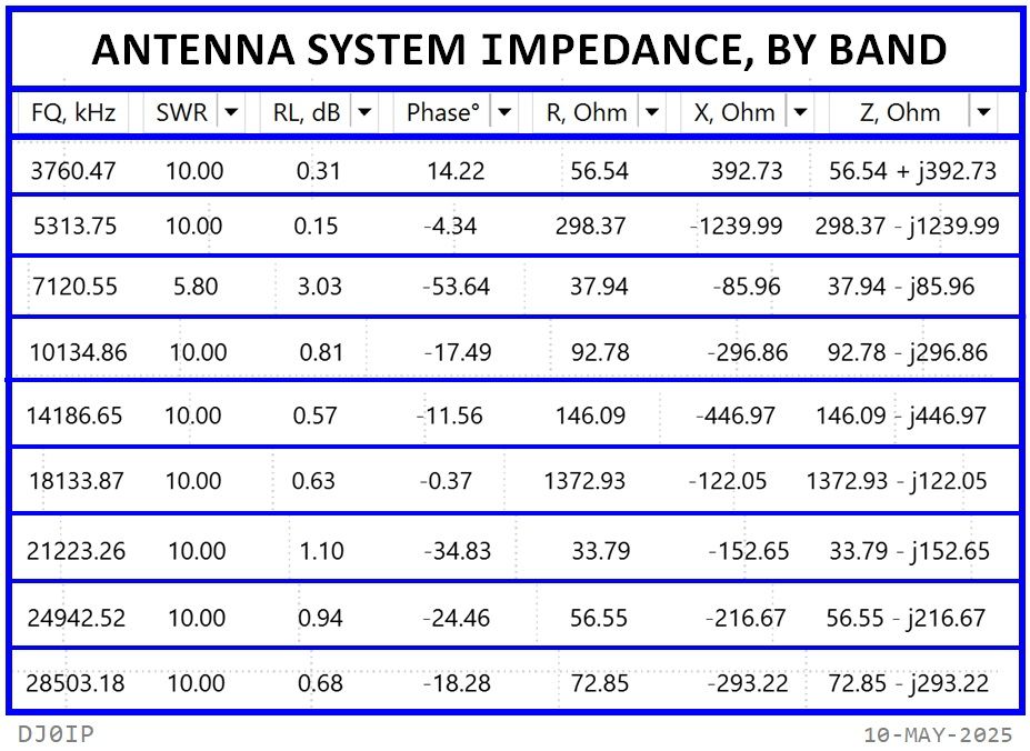 Measurements were viewed in RigExpert "AntScope-2" software and the results (by band) were merged with PowerPoint into this chart.