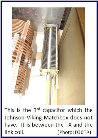 The improved design added taps to the link coil on the TX side of the link, as well as a 3rd variable capacitor in series to the TX. This significantly improved the impedance range that the matchbox can match and often enabled a better match (lower SWR) than with the original J.V. Matchbox