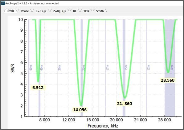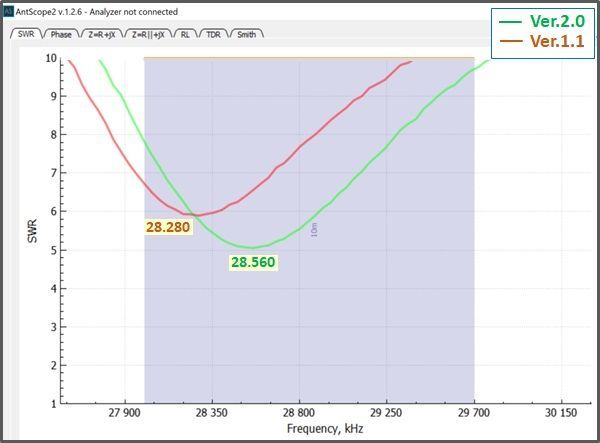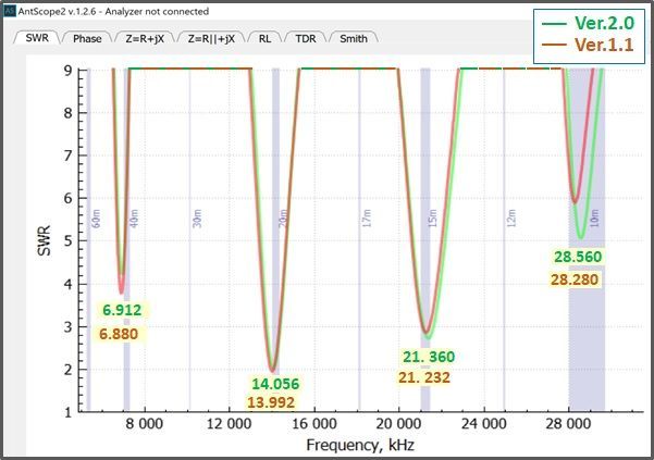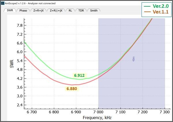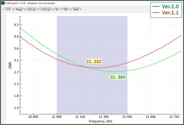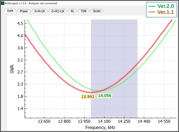 Version 2.0 keeps the same length as Ver.1.1 and Ver.1.2, but has its feedpoint is 1% closer to the Guanella choke-balun.